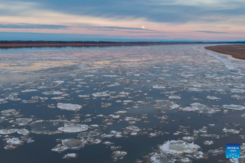 A drone photo taken on Nov. 5, 2025 shows a full moon pictured over the Jiayin section of Heilongjiang River in Yichun City, northeast China's Heilongjiang Province. (Xinhua/Xie Jianfei)
