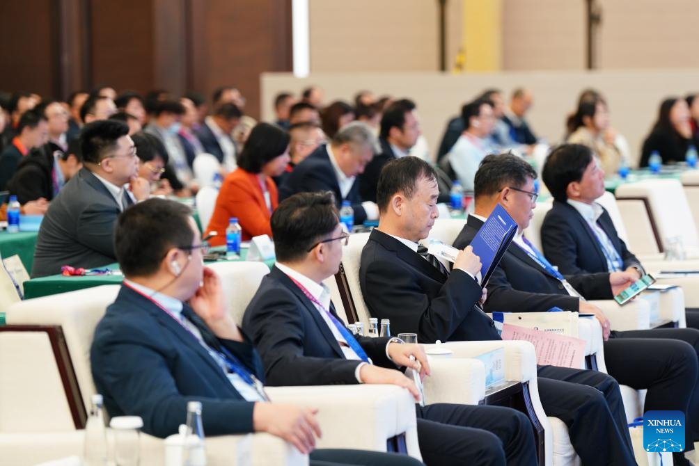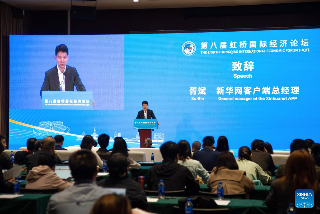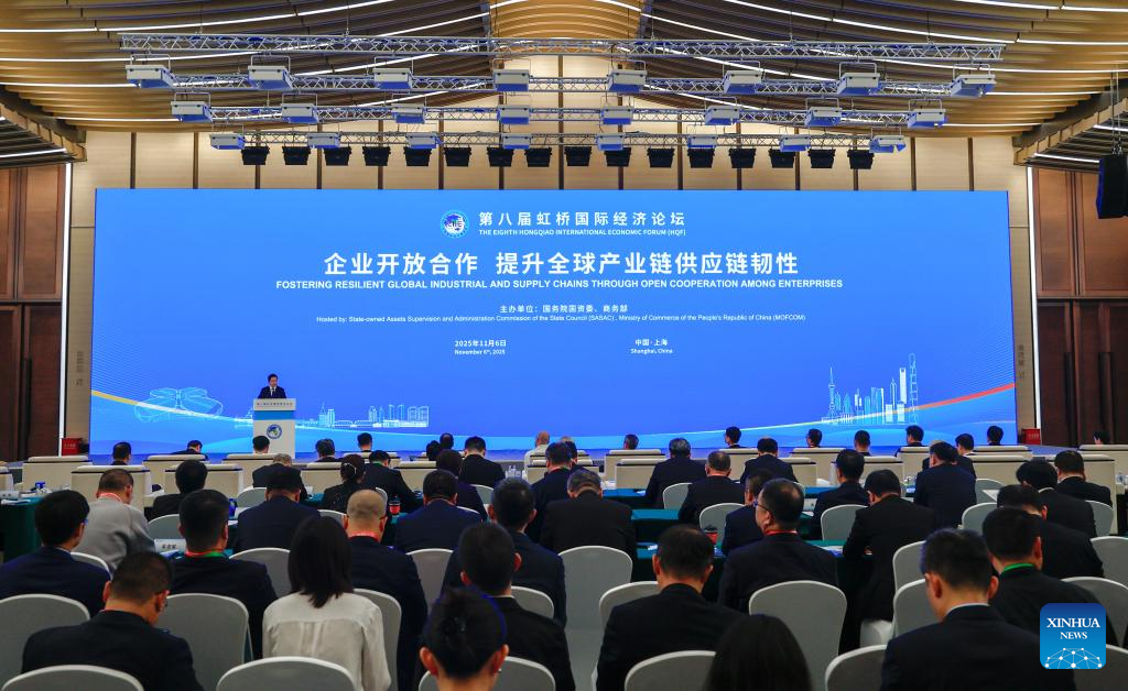 A sub-forum titled "Fostering Resilient Global Industrial and Supply Chains Through Open Cooperation Among Enterprises" is held during the 8th Hongqiao International Economic Forum at the National Exhibition and Convention Center (Shanghai) in Shanghai, east China, Nov. 6, 2025. (Xinhua/Liu Jiaqi)