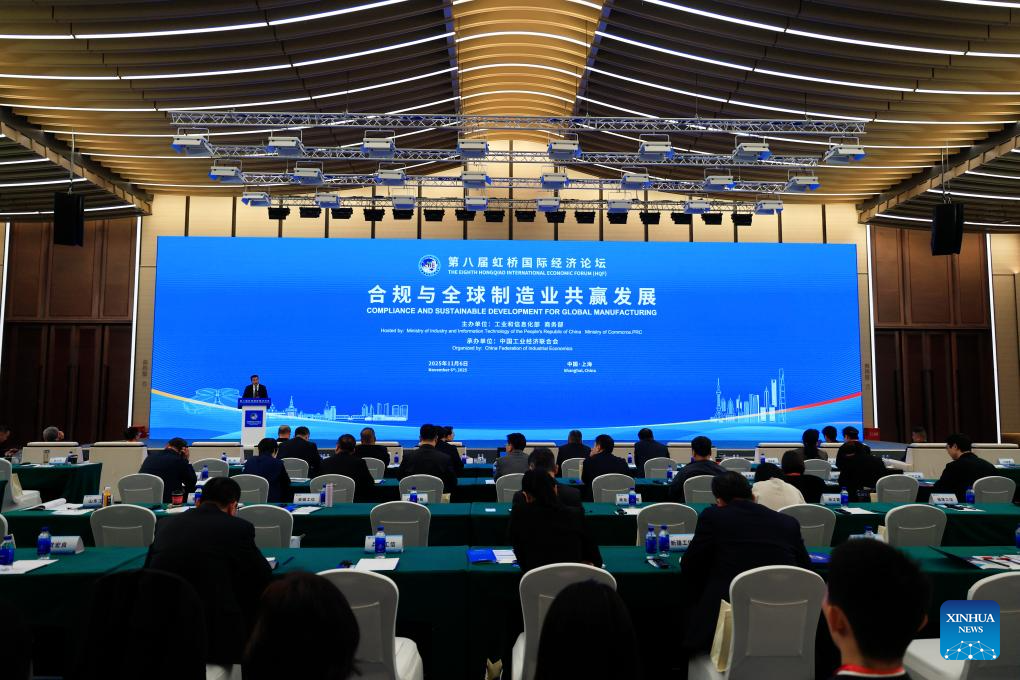 A sub-forum titled "Compliance and Sustainable Development for Global Manufacturing" is held during the 8th Hongqiao International Economic Forum at the National Exhibition and Convention Center (Shanghai) in Shanghai, east China, Nov. 6, 2025. (Xinhua/Liu Jiaqi)