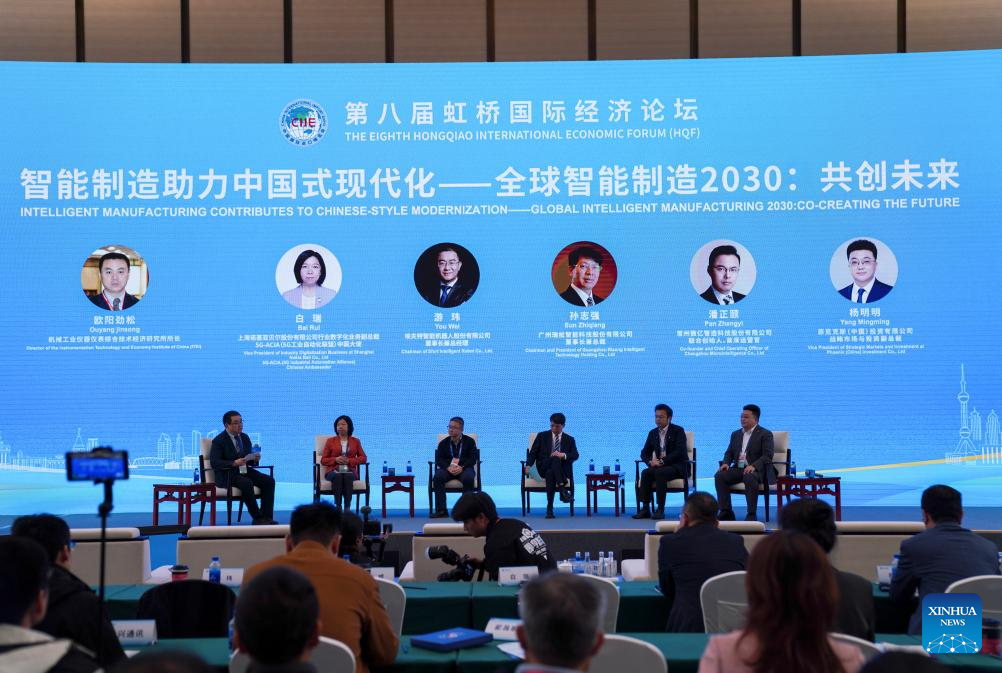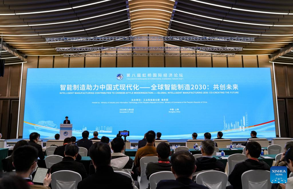 A sub-forum titled "Intelligent Manufacturing Contributes to Chinese-style Modernization -- Global Intelligent Manufacturing 2030: Co-creating the Future" is held during the 8th Hongqiao International Economic Forum at the National Exhibition and Convention Center (Shanghai) in Shanghai, east China, Nov. 6, 2025. (Xinhua/Fan Yuqing)