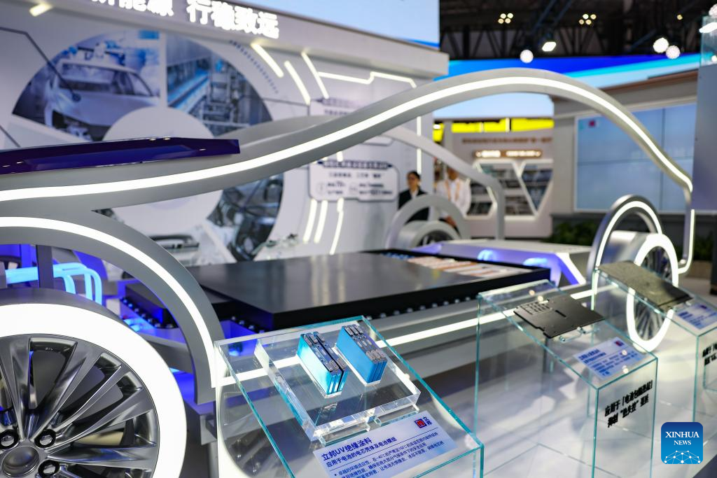 Nippon Paint's coating solution for new energy power battery packs, which made its debt in China, is displayed at the Intelligent Industry and Information Technology exhibition area during the 8th China International Import Expo (CIIE) in east China's Shanghai, Nov. 6, 2025. Many exhibitors debuted their latest products at the 8th CIIE in Shanghai. (Xinhua/Wang Zecong)