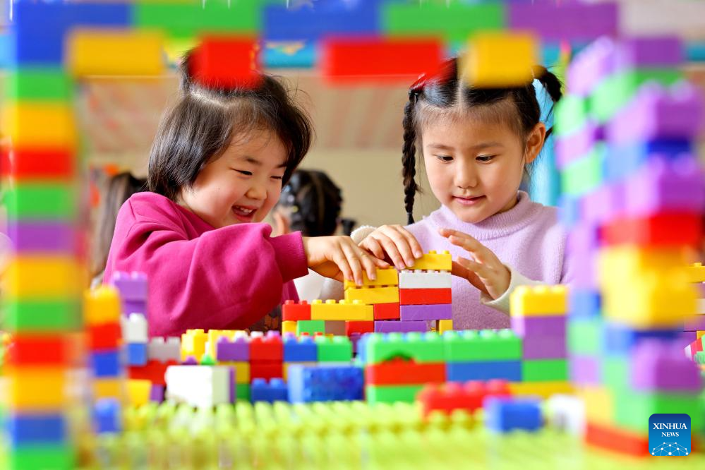 Children of a nursery class build blocks at a kindergarten in Zaozhuang City, east China's Shandong Province, Nov. 6, 2025. Shandong Province has rolled out a series of policies such as developing childcare institutions, increasing kindergarten nursery classes, and offering childcare service in communities to promote its inclusive childcare system, with a focus on the caring of children under three years old. (Photo by Sun Zhongzhe/Xinhua)